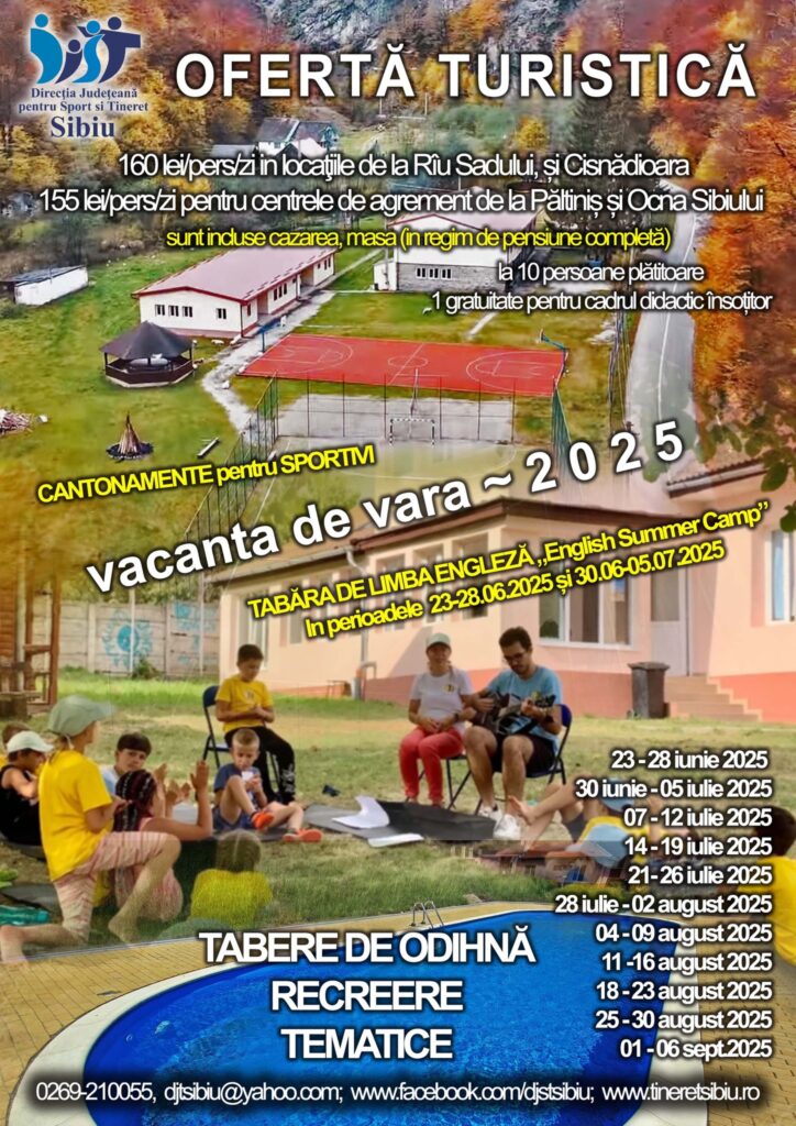 Direcția Județeană pentru Sport și Tineret Sibiu și Direcția Județeană pentru Sport și Tineret Botoșani au lansat ofertele pentru taberele de vară 2025. Cu prețuri subvenționate, condiții excelente și programe atractive, aceste tabere sunt ocazia perfectă pentru o vacanță activă și plină de experiențe noi!