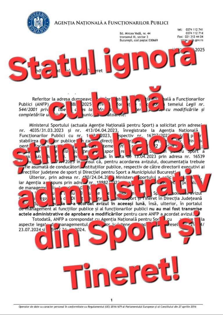 A trecut o lună de la solicitarea oficială transmisă de SNST către Agenția Națională a Funcționarilor Publici (ANFP), iar răspunsurile primite – în două acte – nu oferă soluții, ci doar confirmă ceea ce sindicatul semnalează de aproape 4 ani: situația funcționarilor publici din direcțiile județene pentru sport și tineret este complet blocată.