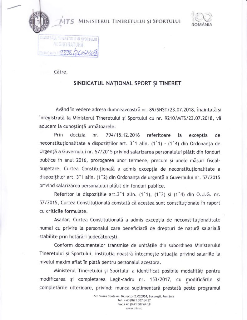 Sindicatul National Sport si Tineret a transmis catre Ministerul Tineretului si Sportului, prin adresa nr. 1347/09.07.2018, o notificare cu referire la: egalizarea salariilor conform Deciziei CCR nr. 794/2016 si O.U.G. nr. 57/2015. Raspunsul MTS a fost primit prin posta: Solicitam MTS sa emita noi decizii de stabilire a salariului de baza incepand cu luna iulie […]