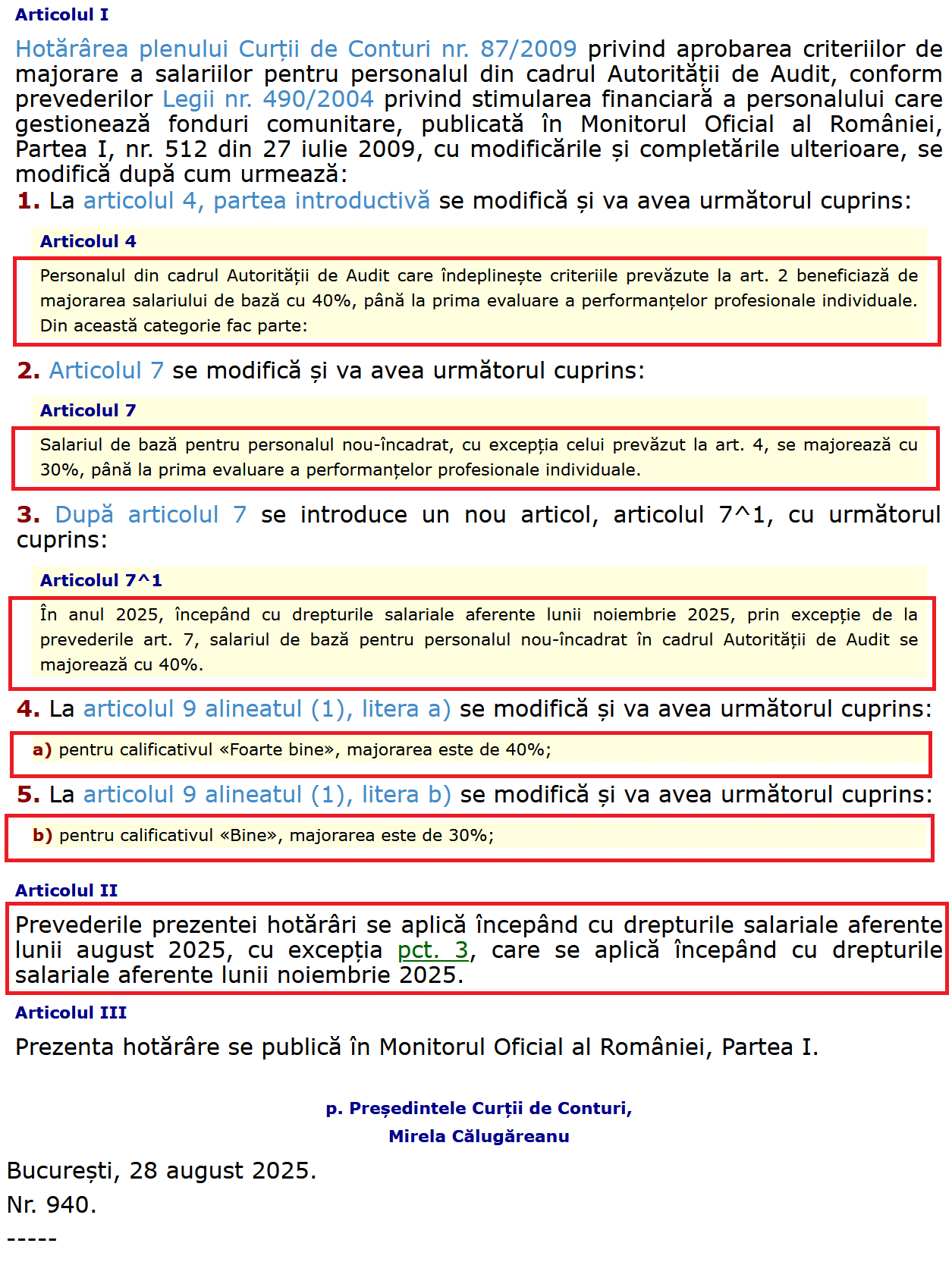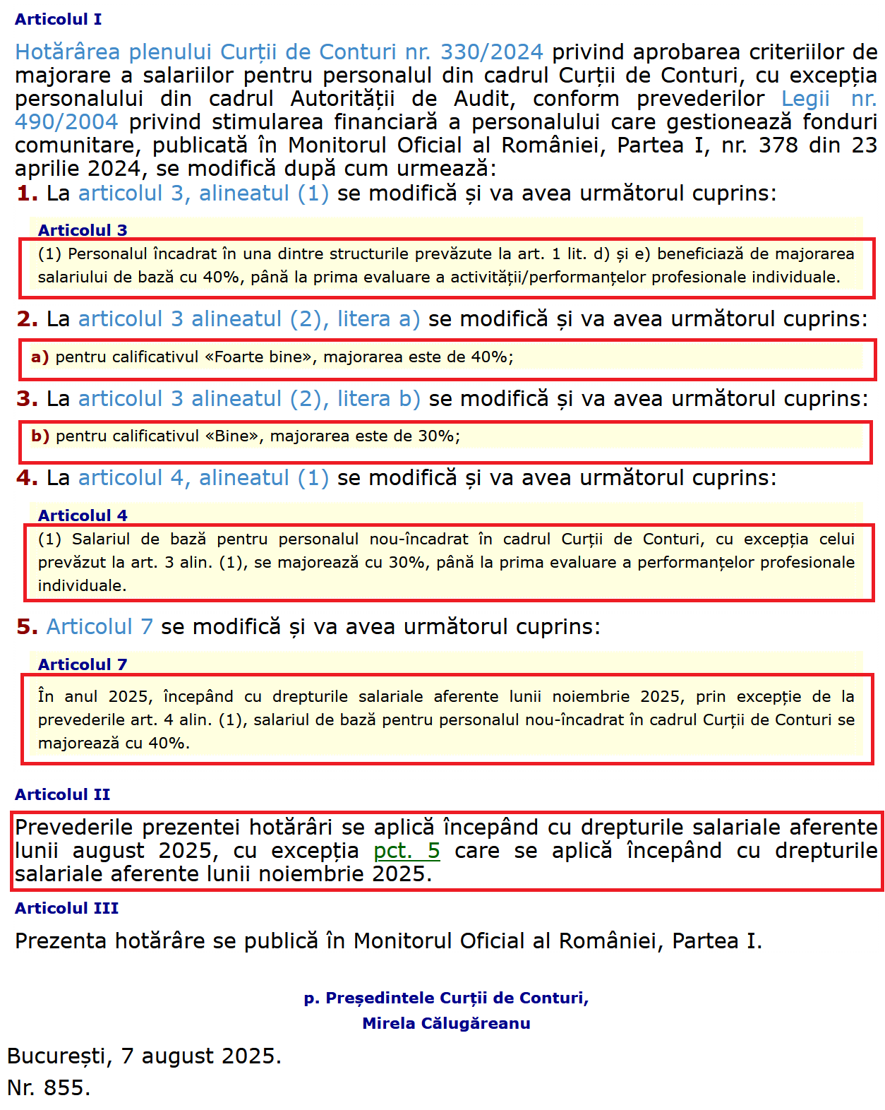Dar în același timp, pentru unii bugetari s-au găsit bani de majorări salariale (creșteri de 30 și 40%)! Hotărârea Plenului Curții de Conturi nr. 855 din 7 august 2025: