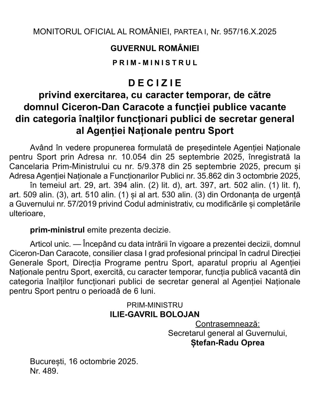 În Monitorul Oficial al României, Partea I, nr. 957 din 16 octombrie 2025, a fost publicată Decizia Prim-ministrului privind exercitarea, cu caracter temporar, de către domnul Ciceron-Dan Caracote, a funcției publice vacante din categoria înalților funcționari publici de secretar general al Agenției Naționale pentru Sport: