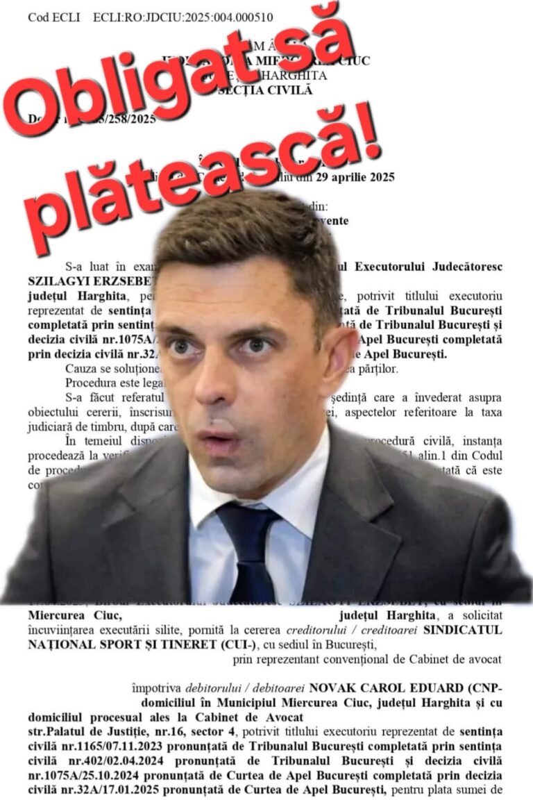 În loc să primească 100.000 de euro de la SNST, Eduard Novak a primit un dosar de executare silită.