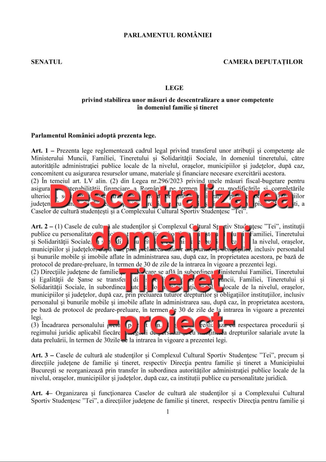 Ministerul Muncii, Familiei, Tineretului și Solidarității Sociale a publicat în transparență decizională, în data de 7 august 2025, un proiect de lege privind descentralizarea competențelor în domeniul familiei și tineretului. Potrivit documentului, în termen de 30 de zile de la adoptare, direcțiile județene de familie și tineret, Casele de cultură ale studenților și Complexul Cultural … Continuă lectura Ministerul Muncii propune descentralizarea domeniului Familie și Tineret