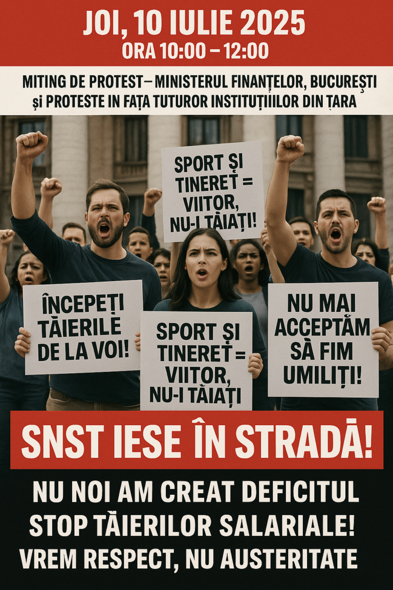 Joi, 10 iulie 2025, Sindicatul Național Sport și Tineret participă la mitingul organizat în fața Ministerului Finanțelor, alături de Blocul Național Sindical și Federația PUBLISIND. Evenimentul face parte dintr-o acțiune comună de protest împotriva măsurilor de austeritate anunțate de Guvern și vizează inclusiv proteste simultane în fața instituțiilor din toată țara.