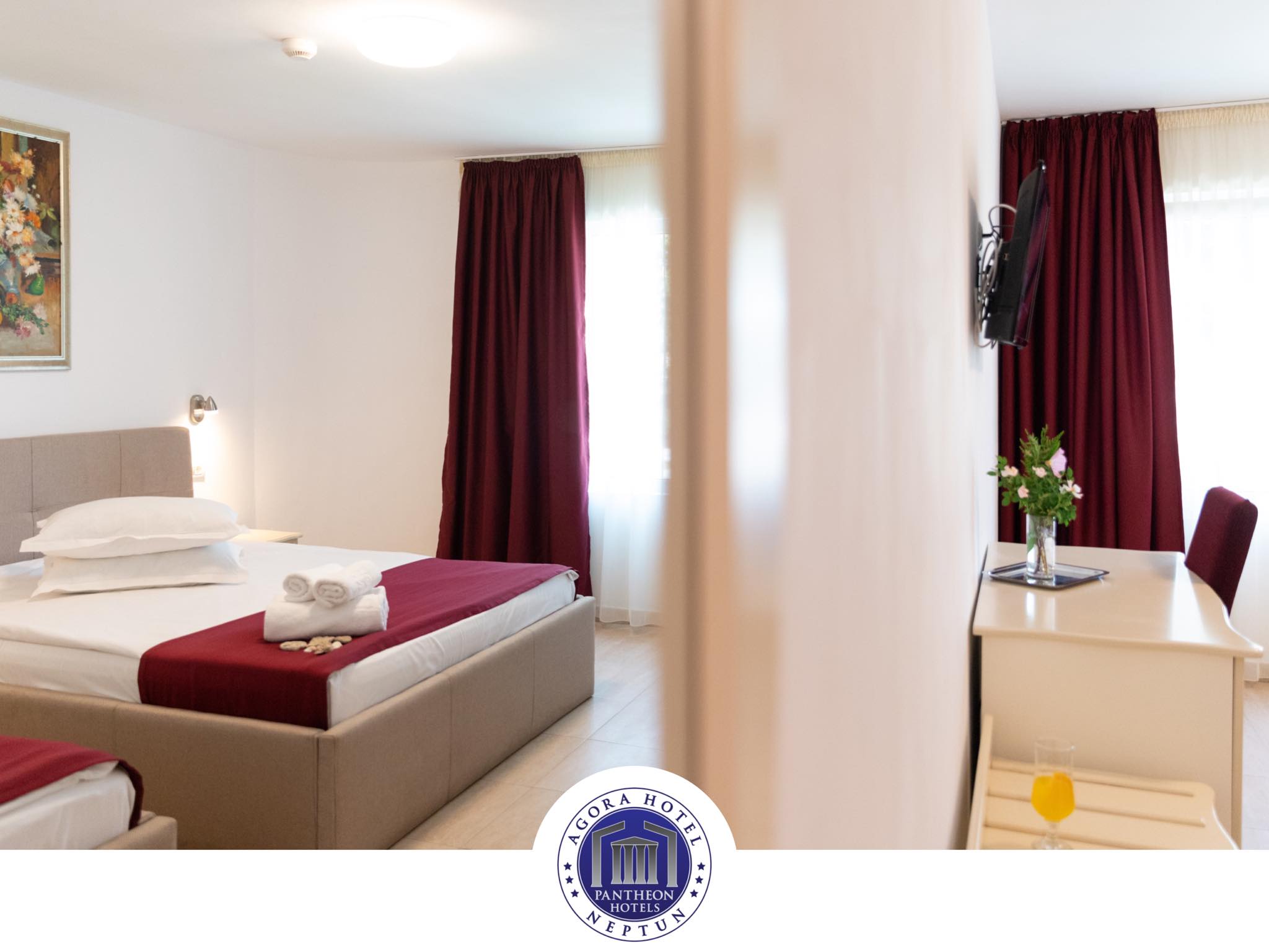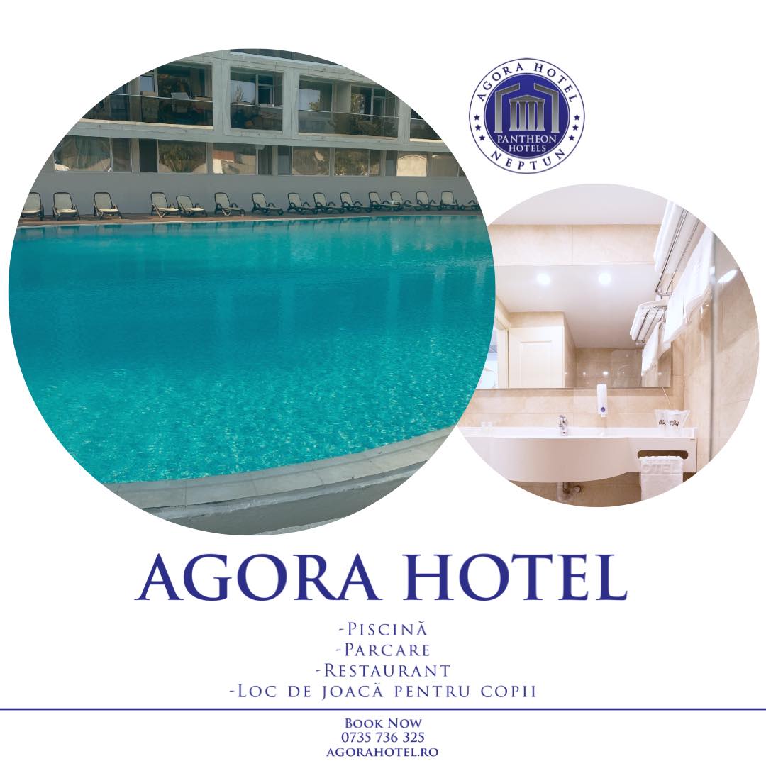AGORA Hotel*** este poziționat la 200 metri distanță de zona centrală a stațiunii Neptun, în imediata apropiere a numeroase restaurante, terase și magazine, fiind dotat cu toate facilitățile necesare unei șederi cât mai agreabile. La 450 metri de plaja „La Steaguri” și 250 metri de gară, înconjurat de o superba oaza de verdeață de circa 10.000 mp, AGORA Hotel*** oferă celor ce îi trec pragul, multiple facilități pentru relaxare, fiind locul ideal pentru o vacanță minunată.