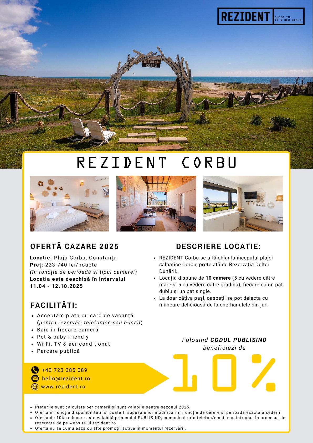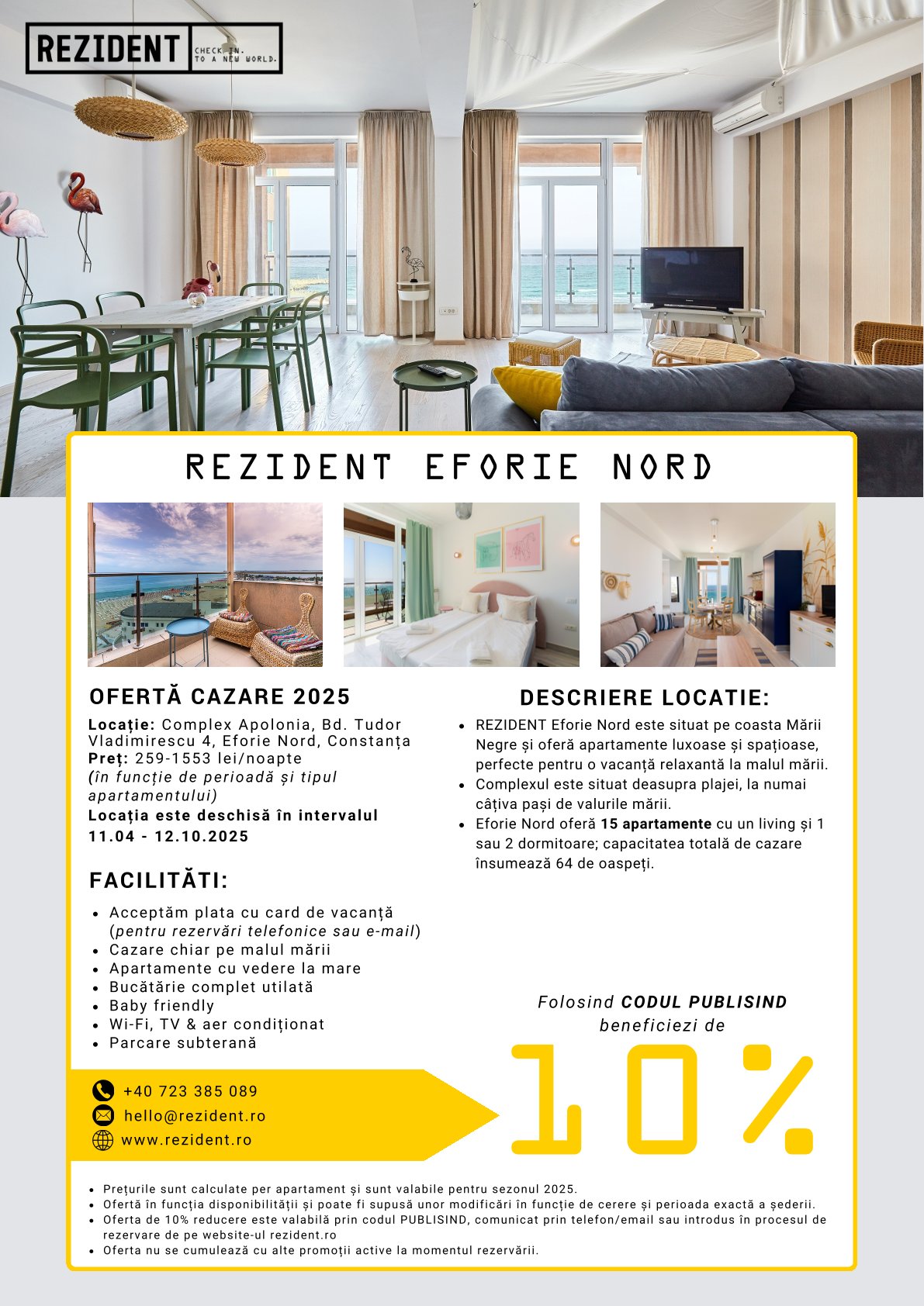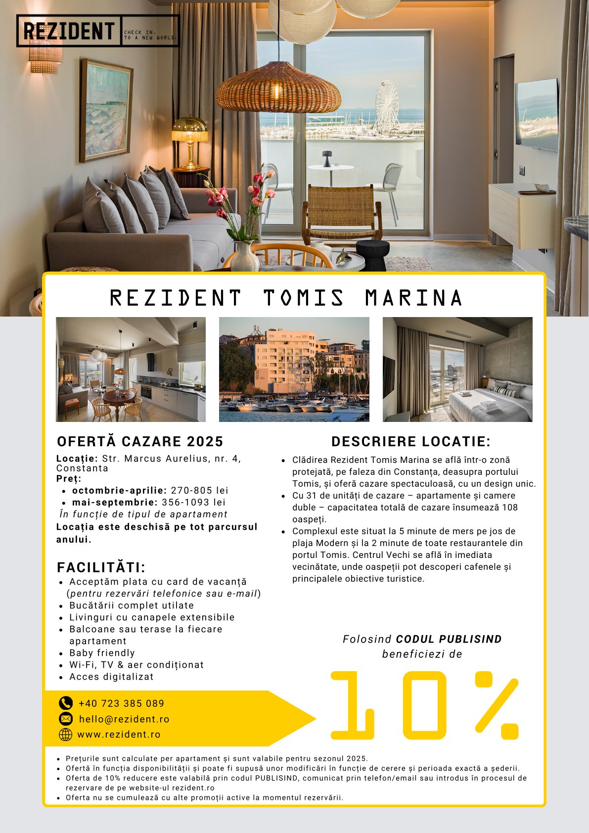 Pentru membrii PUBLISIND oferim un discount de 10% din prețul cazării afișat pe site, pentru locațiile: Rezident Tomis Marina, Rezident Corbu, Rezident Eforie Nord și Rezident Villa Eforie.