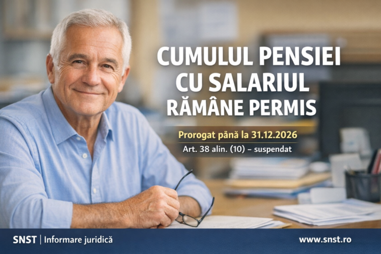Cumulul pensiei cu salariul rămâne permis și în anul 2026 pentru personalul plătit din fonduri publice. Aplicarea interdicției privind cumulul, prevăzută de art. 38 alin. (10) din Legea-cadru nr. 153/2017, a fost suspendată și prorogată până la data de 31 decembrie 2026.
