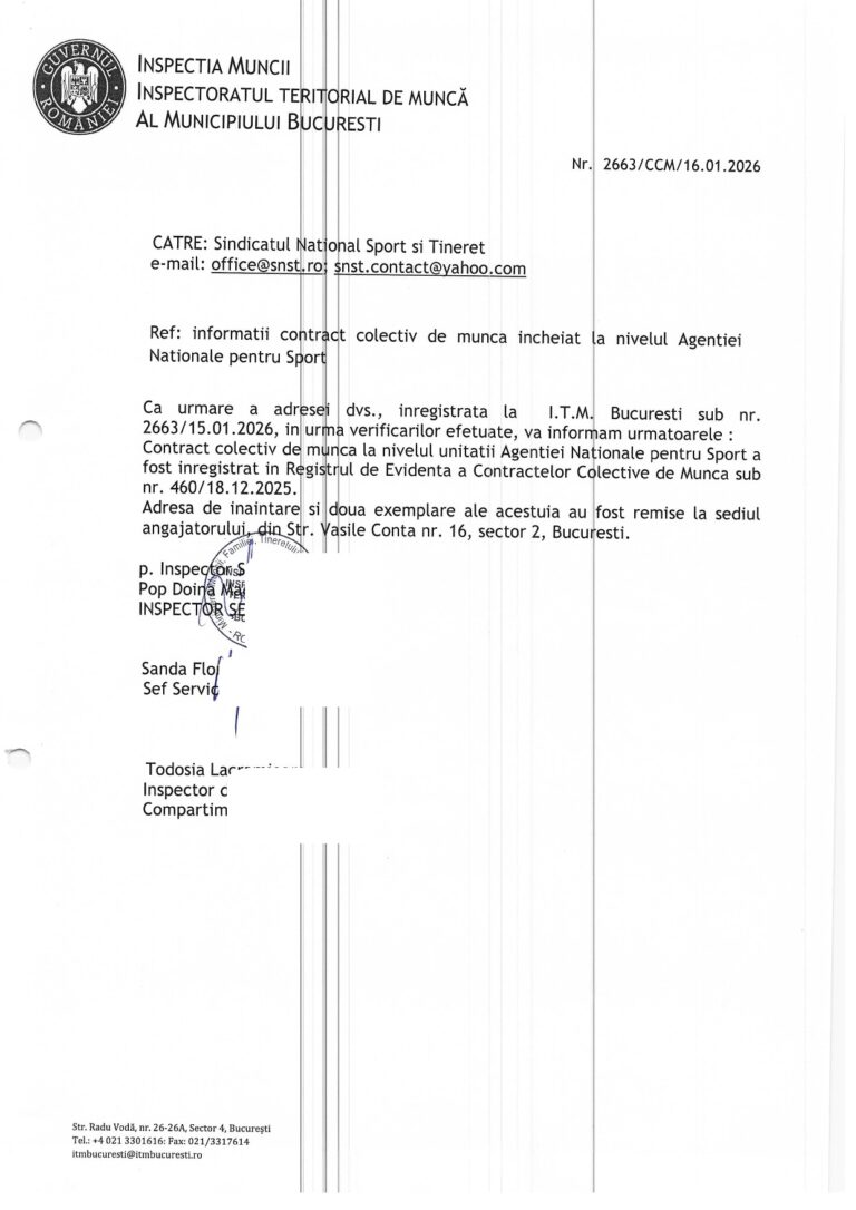 Inspectoratul Teritorial de Muncă București a eliberat dovada înregistrării Contractului și Acordului colectiv de muncă la nivel de unitate, documente semnate de Agenția Națională pentru
