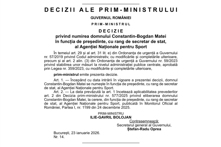 La câteva zile după informațiile apărute în spațiul public privind revenirea lui Constantin-Bogdan Matei la conducerea Agenției Naționale pentru Sport, numirea a fost confirmată oficial