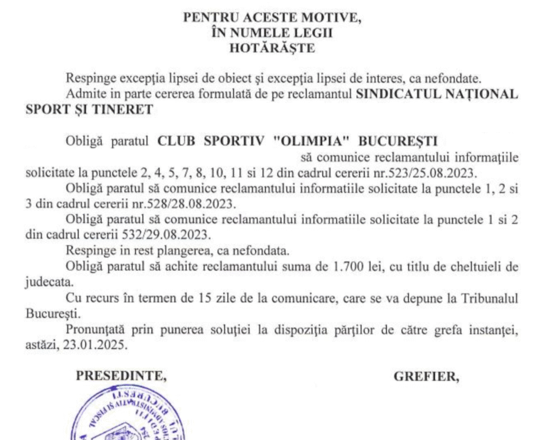 Tribunalul București a comunicat sentința pronunțată în dosarul nr. 30183/3/2023 prin care a obligat Clubul Sportiv Olimpia București să transmită către Sindicatul Național Sport și