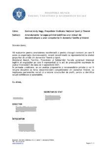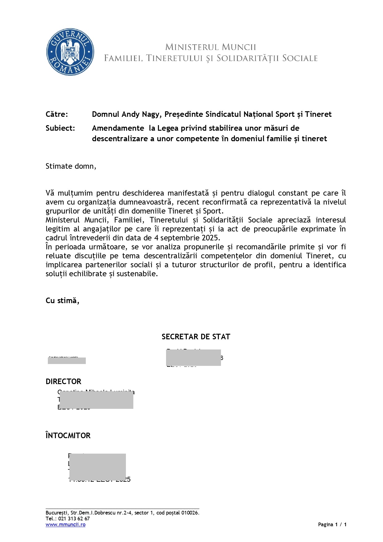 Totodată, așteptăm propuneri și din partea colegilor din direcțiile județene pentru tineret și alte unități vizate de transferul către Agenția Națională pentru Sport. În toate aceste cazuri, contractele colective de muncă și drepturile câștigate trebuie respectate în baza Codului muncii și a Legii dialogului social nr. 367/2022.