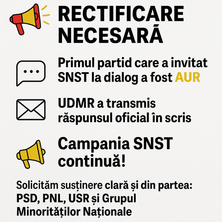 În urma publicării articolului „Primul răspuns oficial a venit…”, suntem datori să facem următoare corecție: Primul partid care a răspuns apelului SNST și a acționat concret a fost Partidul AUR.