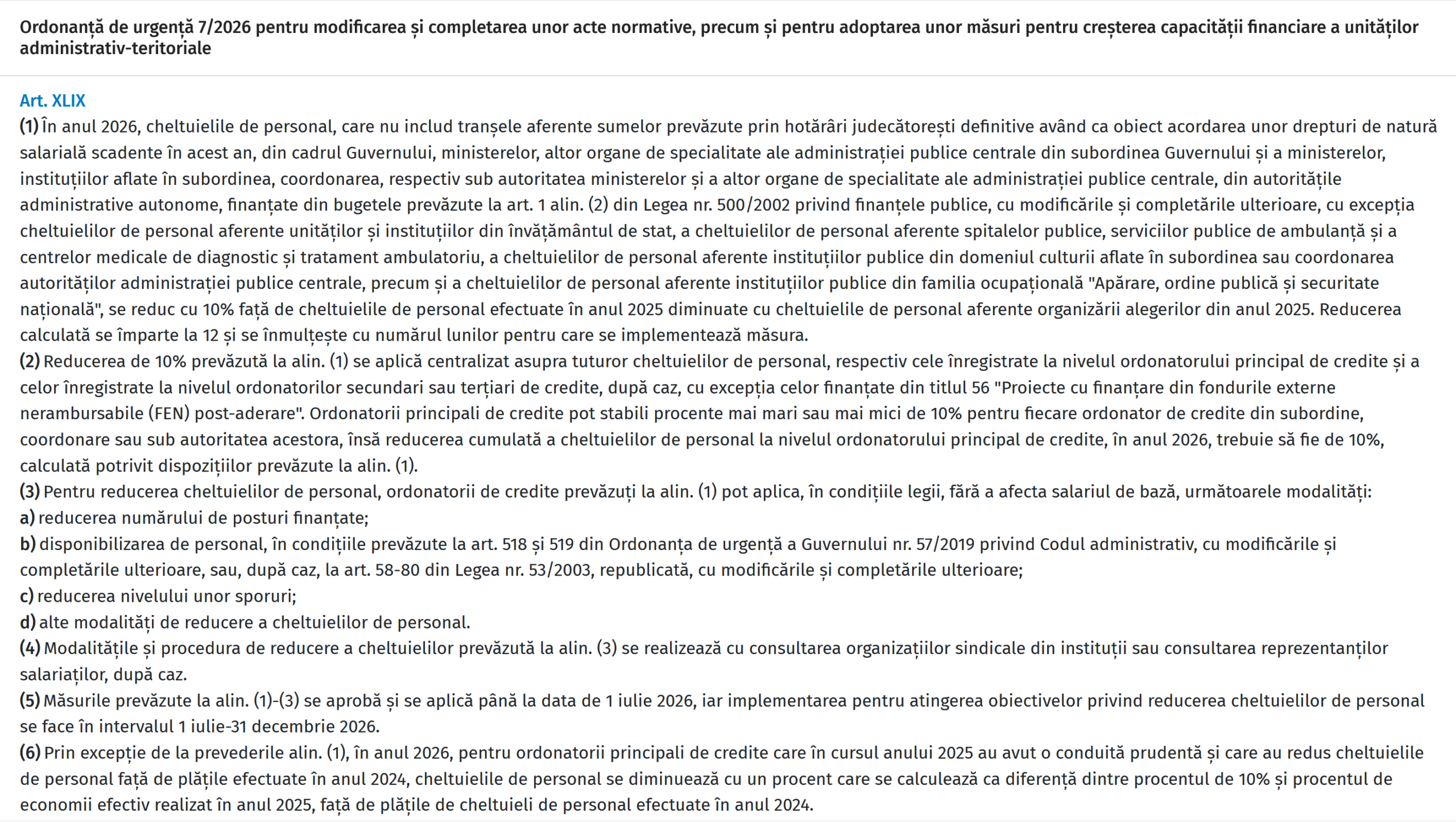 Art. XLIX din OUG nr. 7/2026 stabilește în mod clar că măsurile privind reducerea cheltuielilor de personal se aprobă până la data de 1 iulie 2026, iar implementarea acestora are loc în perioada 1 iulie – 31 decembrie 2026.