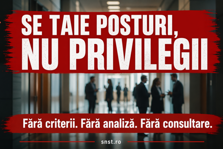 SNST solicită tuturor angajatorilor să respecte cadrul legal, să nu adopte decizii pripite și să trateze cu maximă responsabilitate procedura de consultare sindicală. Avem propuneri și soluții concrete. Nu luați decizii în grabă – apelați la dialog, iar împreună vom identifica variante legale pentru fiecare instituție, fără concedieri abuzive.