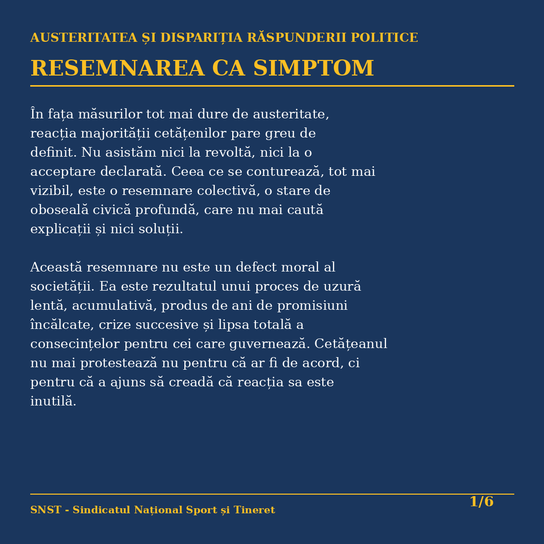Resemnarea nu este lipsă de interes și nici slăbiciune morală. Este rezultatul unui proces de uzură lentă, acumulată în ani de promisiuni încălcate, crize succesive și lipsă totală de consecințe pentru cei care guvernează.