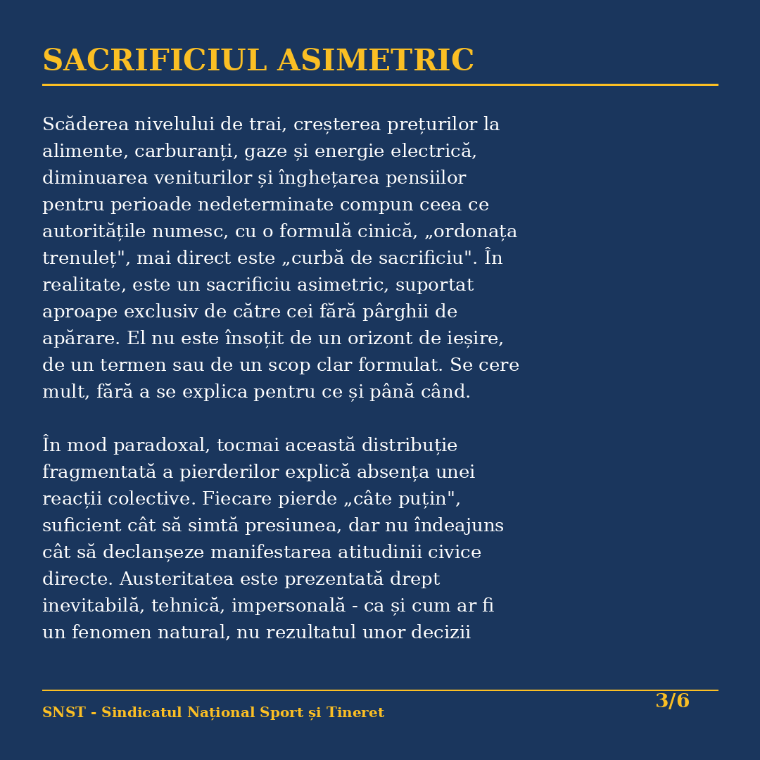 Scăderea nivelului de trai, explozia prețurilor, înghețarea veniturilor și pensiilor sunt prezentate ca „inevitabile”. Tehnice. Impersonale. În realitate, este un sacrificiu asimetric, suportat aproape exclusiv de cei fără pârghii de apărare. Se cere mult. Fără explicații clare. Fără un termen. Fără un scop explicit.