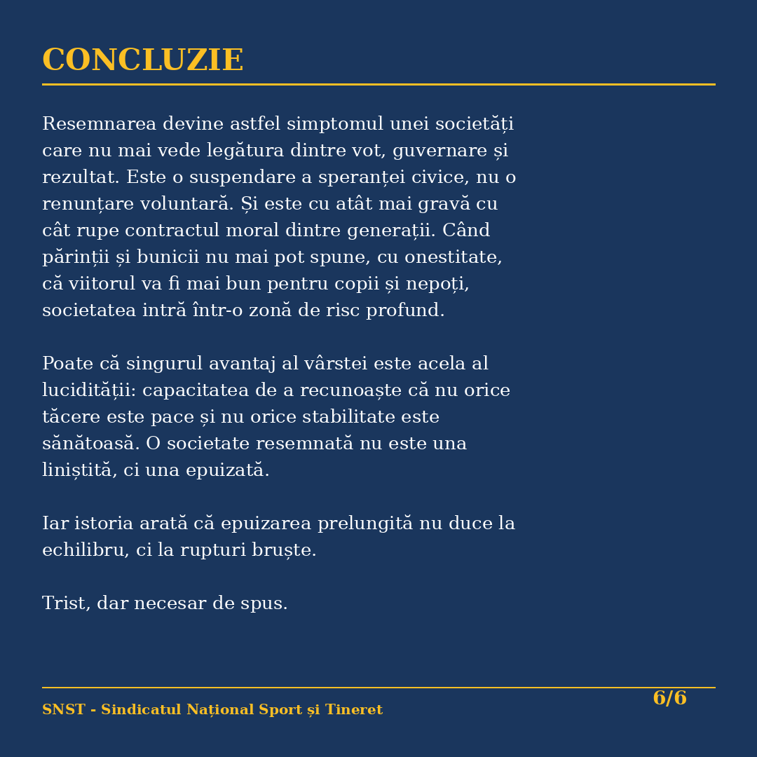 Resemnarea devine simptomul unei societăți care nu mai vede legătura dintre vot, guvernare și rezultat. Nu este liniște. Este epuizare. Iar istoria arată clar: epuizarea prelungită nu duce la echilibru, ci la rupturi bruște.