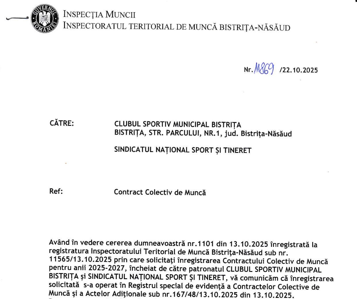 Inspectoratul Teritorial de Muncă Bistrița-Năsăud a eliberat dovada înregistrării Contractului colectiv de muncă la nivel de unitate, document semnat de Clubul Sportiv Municipal Bistrița și Sindicatul Național Sport și Tineret. Pentru o perioadă de doi ani membrii de sindicat din cadrul acestei unități vor fi apărați de prevederile CCM, un demers binevenit prin care este asigurat cadrul legal de protecție a membrilor și acordarea unor beneficii:
