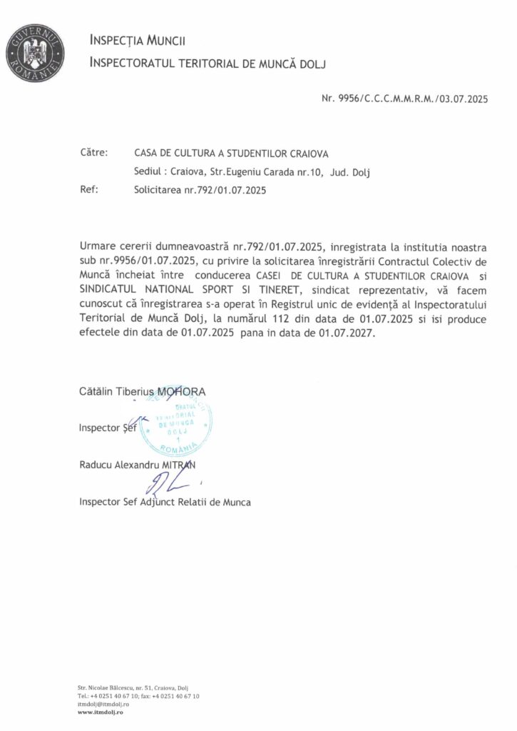 Inspectoratul Teritorial de Muncă Dolj a eliberat dovada înregistrării Contractului / Acordului colectiv de muncă la nivel de unitate, document semnat de Casa de Cultură a Studenților Craiova și Sindicatul Național Sport și Tineret. Pentru o perioadă de doi ani membrii de sindicat din cadrul acestei unități vor fi apărați de prevederile CCM/ACM, un demers binevenit prin care este asigurat cadrul legal de protecție a membrilor și acordarea unor beneficii: