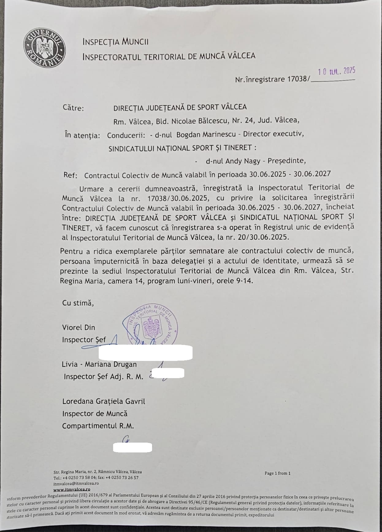 Inspectoratul Teritorial de Muncă Vălcea a eliberat dovada înregistrării Contractului / Acordului colectiv de muncă la nivel de unitate, document semnat de Direcția Județeană pentru Sport Vâlcea și Sindicatul Național Sport și Tineret. Pentru o perioadă de doi ani membrii de sindicat din cadrul acestei unități vor fi apărați de prevederile CCM/ACM, un demers binevenit prin care este asigurat cadrul legal de protecție a membrilor și acordarea unor beneficii: