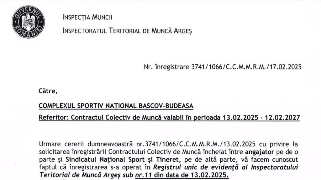 Inspectoratul Teritorial de Muncă Argeș a eliberat dovada înregistrării Contractului colectiv de muncă la nivel de unitate, document semnat de Complexul Sportiv Național Bascov și Sindicatul Național Sport și Tineret. Pentru o perioadă de doi ani membrii de sindicat din cadrul acestei unități vor fi apărați de prevederile CCM, un demers binevenit prin care este asigurat cadrul legal de protecție a membrilor și acordarea unor beneficii:
