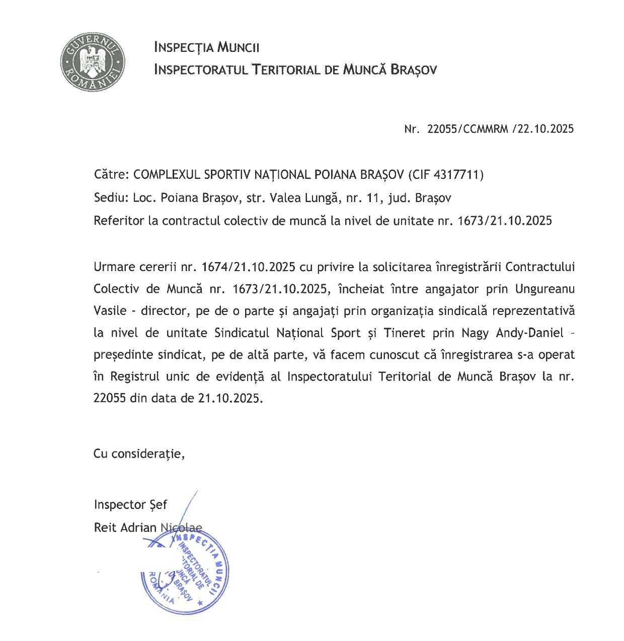Inspectoratul Teritorial de Muncă Brașov a eliberat dovada înregistrării Contractului colectiv de muncă la nivel de unitate, document semnat de Complexul Sportiv Național Poiana Brașov și Sindicatul Național Sport și Tineret. Pentru o perioadă de doi ani membrii de sindicat din cadrul acestei unități vor fi apărați de prevederile CCM, un demers binevenit prin care este asigurat cadrul legal de protecție a membrilor și acordarea unor beneficii: