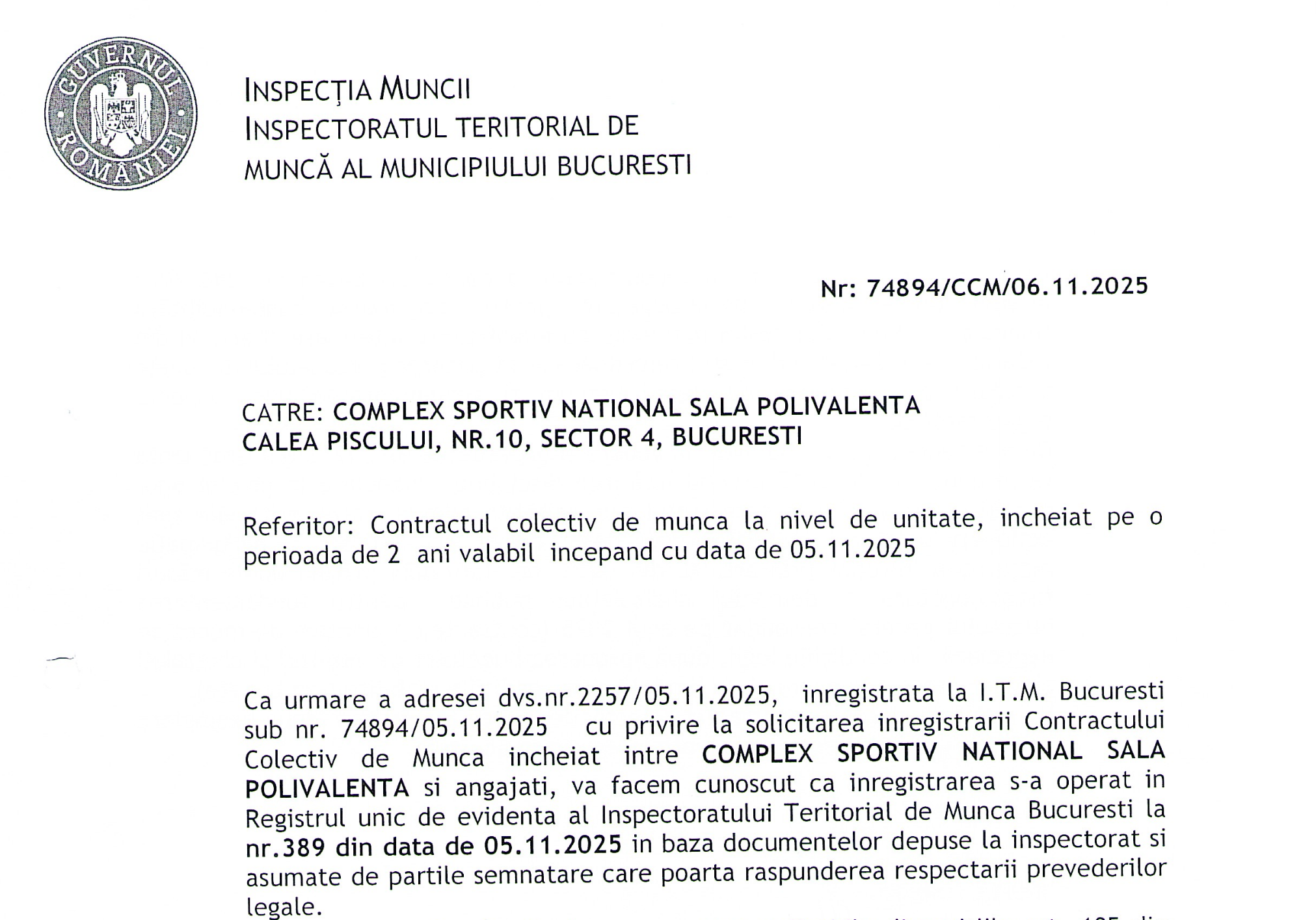 Inspectoratul Teritorial de Muncă București a eliberat dovada înregistrării Contractului colectiv de muncă la nivel de unitate, document semnat de Complexul Sportiv Național Sala Polivalentă și Sindicatul Național Sport și Tineret. Pentru o perioadă de doi ani membrii de sindicat din cadrul acestei unități vor fi apărați de prevederile CCM, un demers binevenit prin care este asigurat cadrul legal de protecție a membrilor și acordarea unor beneficii: