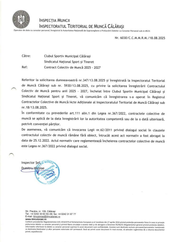 Inspectoratul Teritorial de Muncă Călărași a eliberat dovada înregistrării Contractului colectiv de muncă la nivel de unitate, document semnat de Clubul Sportiv Municipal Călărași și Sindicatul Național Sport și Tineret. Pentru o perioadă de doi ani membrii de sindicat din cadrul acestei unități vor fi apărați de prevederile CCM, un demers binevenit prin care este asigurat cadrul legal de protecție a membrilor și acordarea unor beneficii: