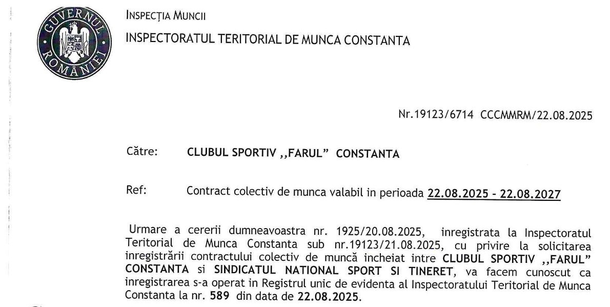 Inspectoratul Teritorial de Muncă Constanța a eliberat dovada înregistrării Contractului colectiv de muncă la nivel de unitate, document semnat de Clubul Sportiv “Farul” Constanța și Sindicatul Național Sport și Tineret. Pentru o perioadă de doi ani membrii de sindicat din cadrul acestei unități vor fi apărați de prevederile CCM, un demers binevenit prin care este asigurat cadrul legal de protecție a membrilor și acordarea unor beneficii: