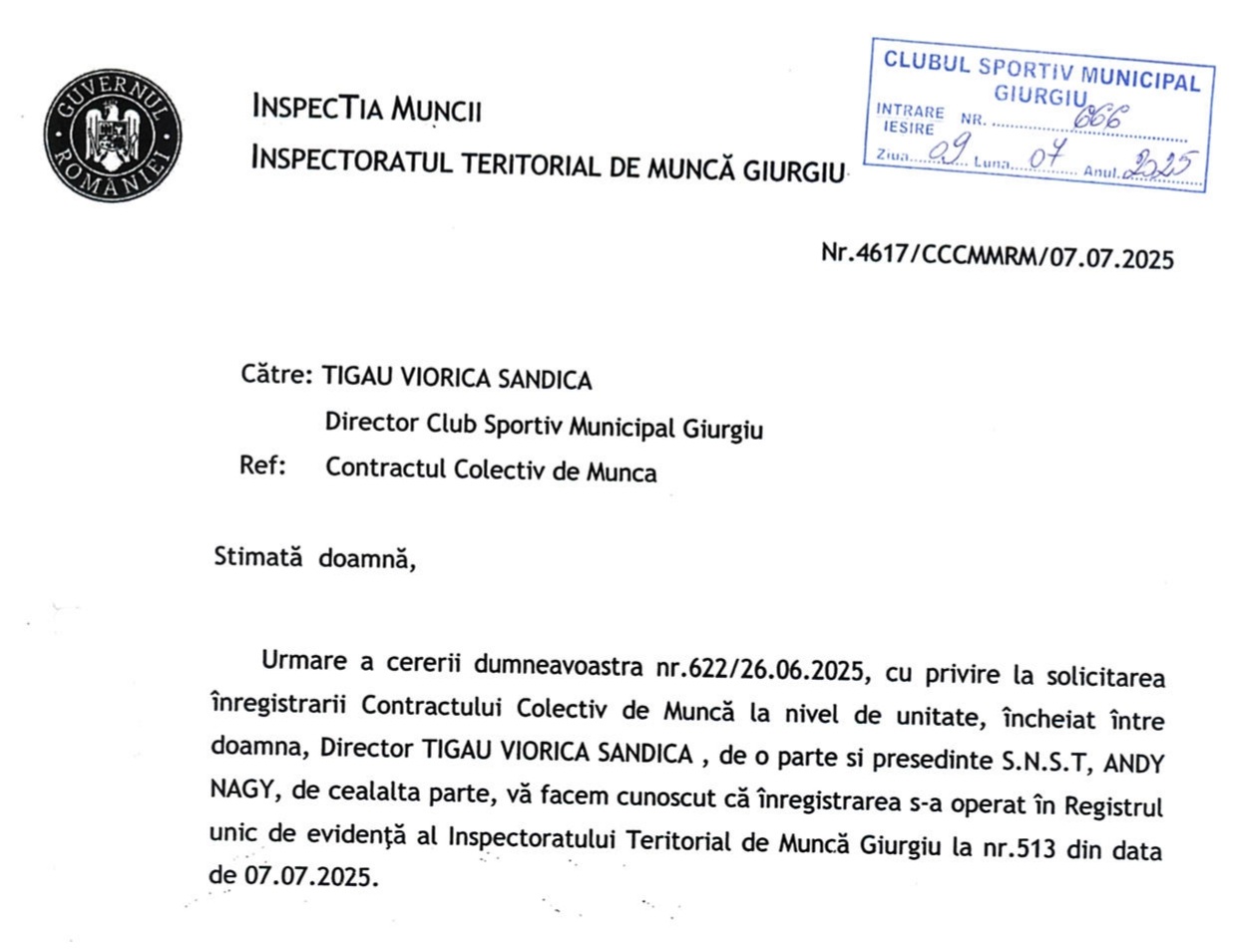 Inspectoratul Teritorial de Muncă Giurgiu a eliberat dovada înregistrării Contractului colectiv de muncă la nivel de unitate, document semnat de Clubul Sportiv Municipal Giurgiu și Sindicatul Național Sport și Tineret. Pentru o perioadă de doi ani membrii de sindicat din cadrul acestei unități vor fi apărați de prevederile CCM/ACM, un demers binevenit prin care este asigurat cadrul legal de protecție a membrilor și acordarea unor beneficii: