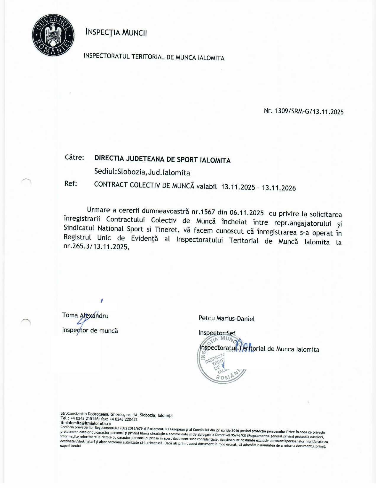 Inspectoratul Teritorial de Muncă Ialomița a eliberat dovada înregistrării Contractului colectiv de muncă la nivel de unitate, document semnat de Direcția Județeană de Sport Ialomița și Sindicatul Național Sport și Tineret. Pentru o perioadă de doi ani membrii de sindicat din cadrul acestei unități vor fi apărați de prevederile CCM, un demers binevenit prin care este asigurat cadrul legal de protecție a membrilor și acordarea unor beneficii: