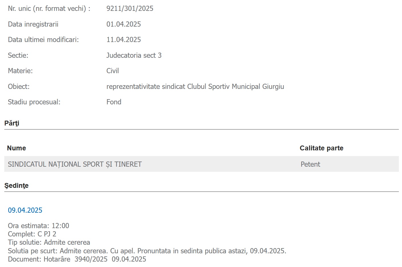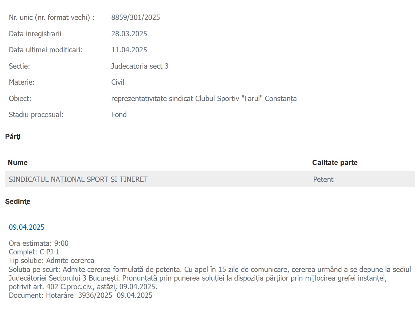 Judecătoria sectorului 3 București a constatat că Sindicatul Național Sport și Tineret – SNST este reprezentativ la nivelul următoarelor unități: Clubul Sportiv “Farul” Constanţa, Clubul Sporturilor Tehnico-Aplicative Suceava, Clubul Atletic Roman și Clubul Sportiv Municipal Giurgiu: