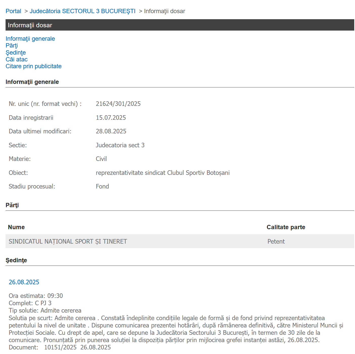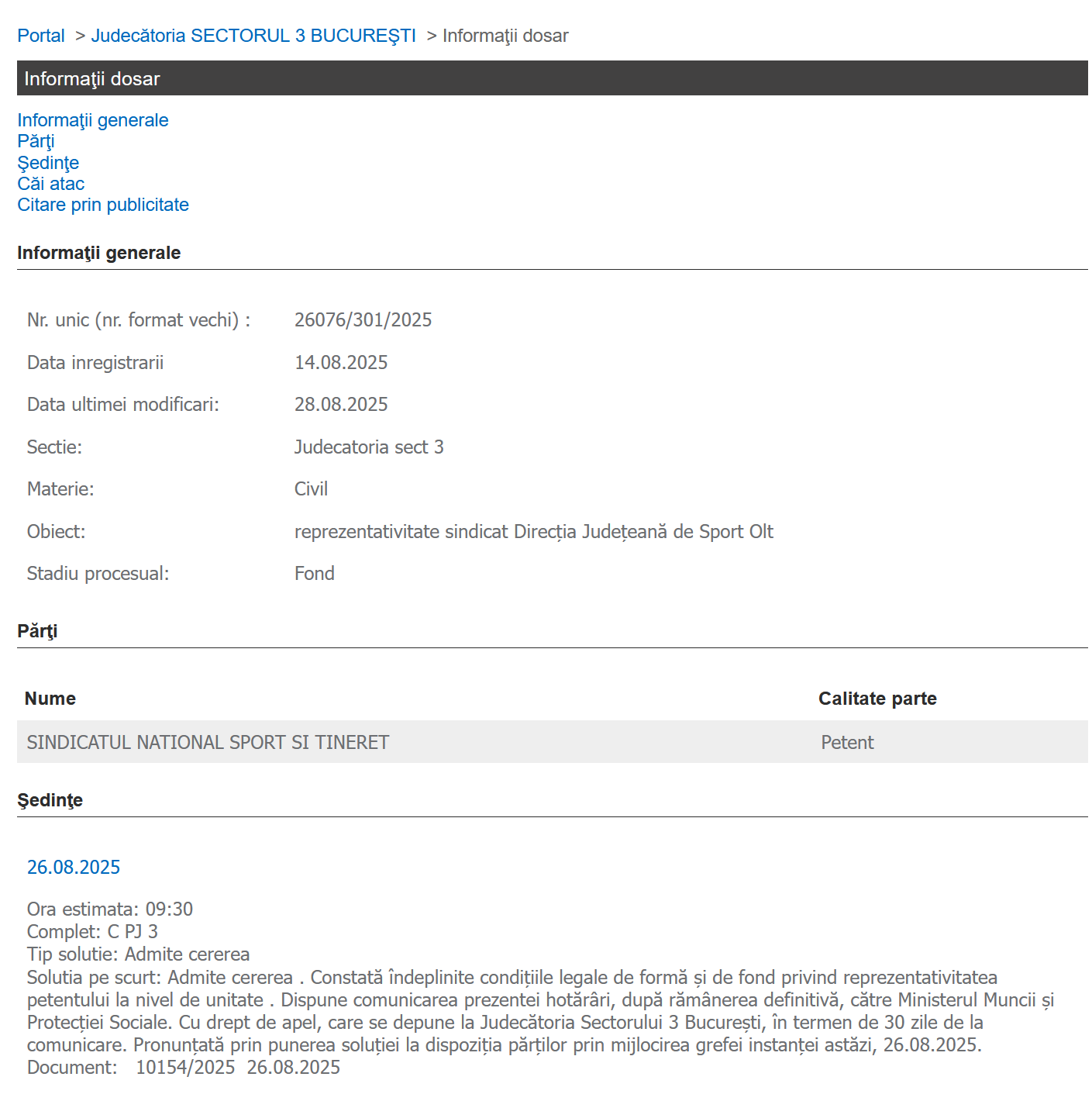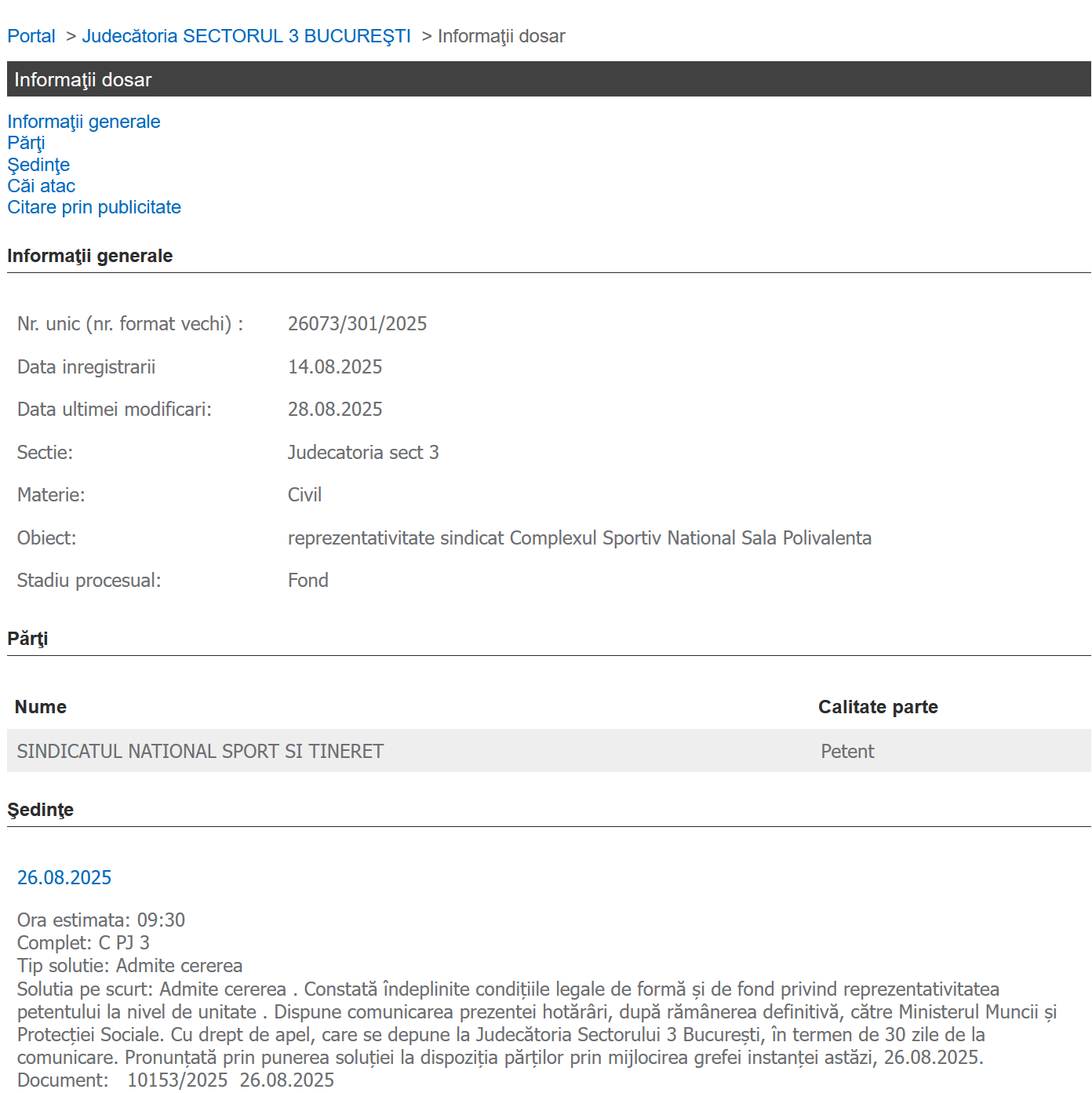 Judecătoria sectorului 3 București a constatat că Sindicatul Național Sport și Tineret – SNST este reprezentativ la nivelul următoarelor unități: Complexul Cultural Sportiv Studenţesc Tei, Direcţia Judeţeană de Sport Olt, Clubul Sportiv Botoşani și Complexul Sportiv Național Sala Polivalentă București: