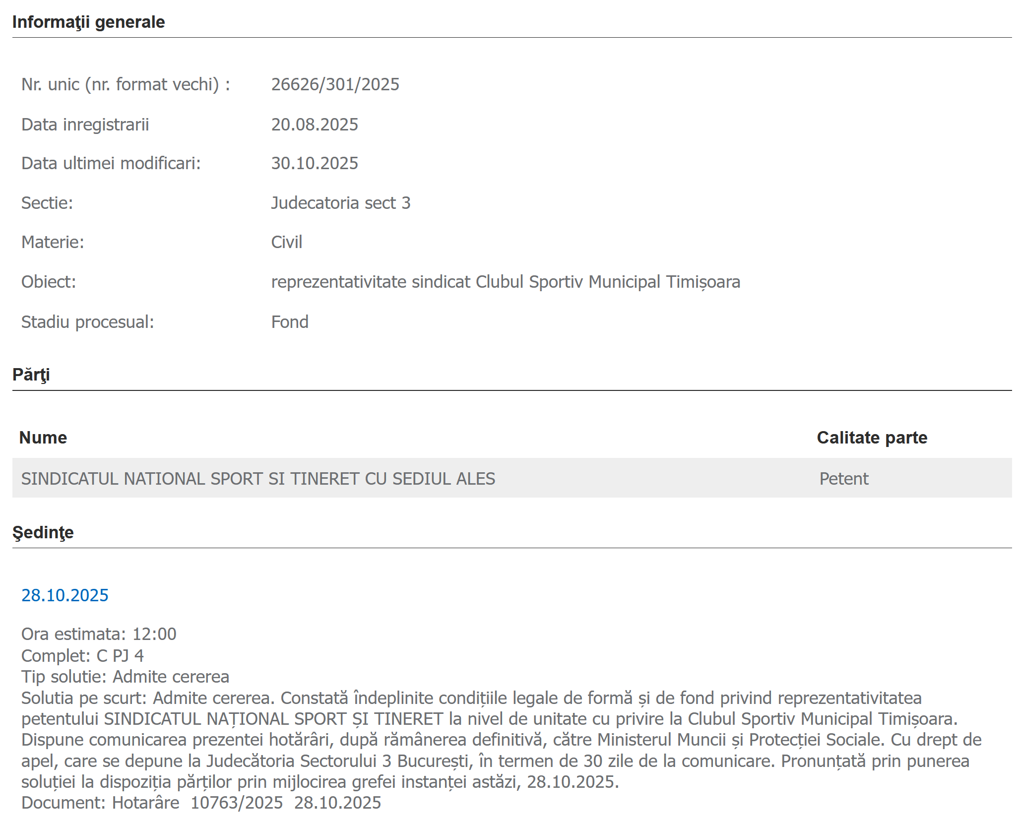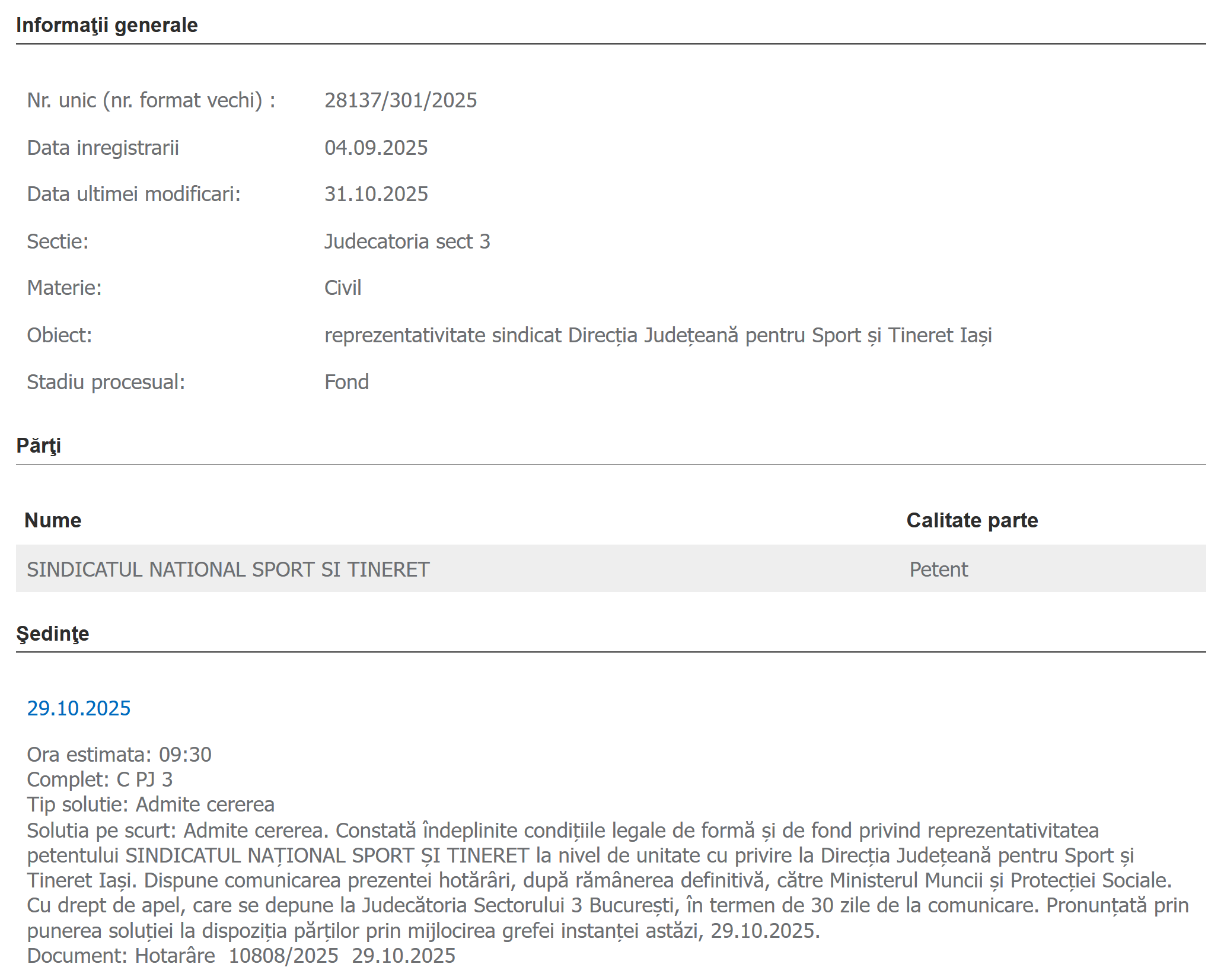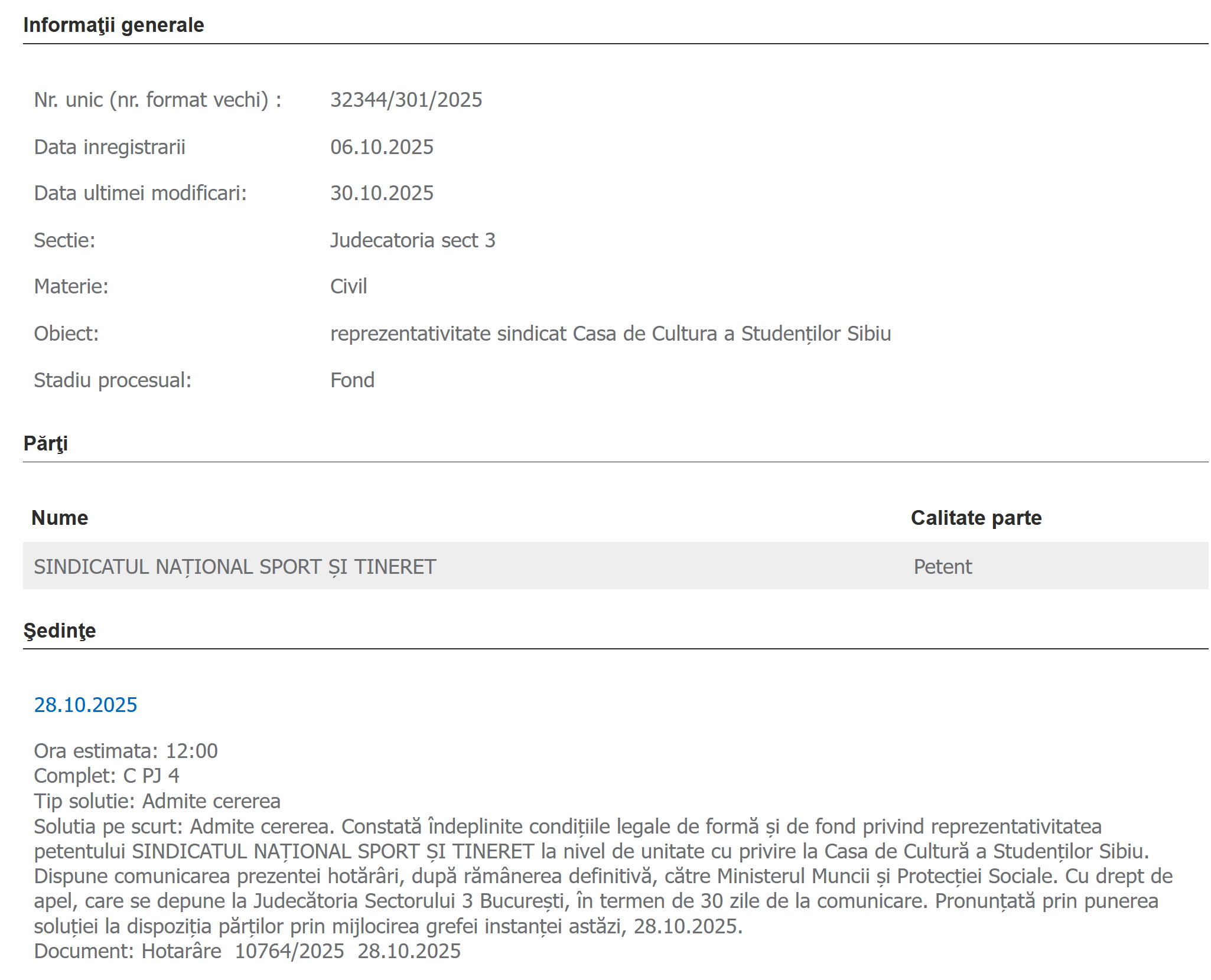 Judecătoria sectorului 3 București a constatat că Sindicatul Național Sport și Tineret – SNST este reprezentativ la nivelul următoarelor unități: Casa de Cultură a Studenţilor Sibiu, Clubul Sportiv Municipal Timişoara, Direcţia Judeţeană pentru Sport şi Tineret Iaşi, Clubul Sportiv Municipal Drobeta Turnu-Severin, Casa de Cultura a Studenţilor Târgu Mureş și Clubul Sportiv “Chimia” Râmnicu Vâlcea: