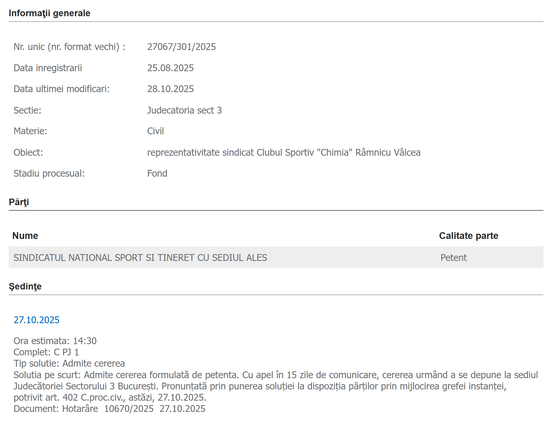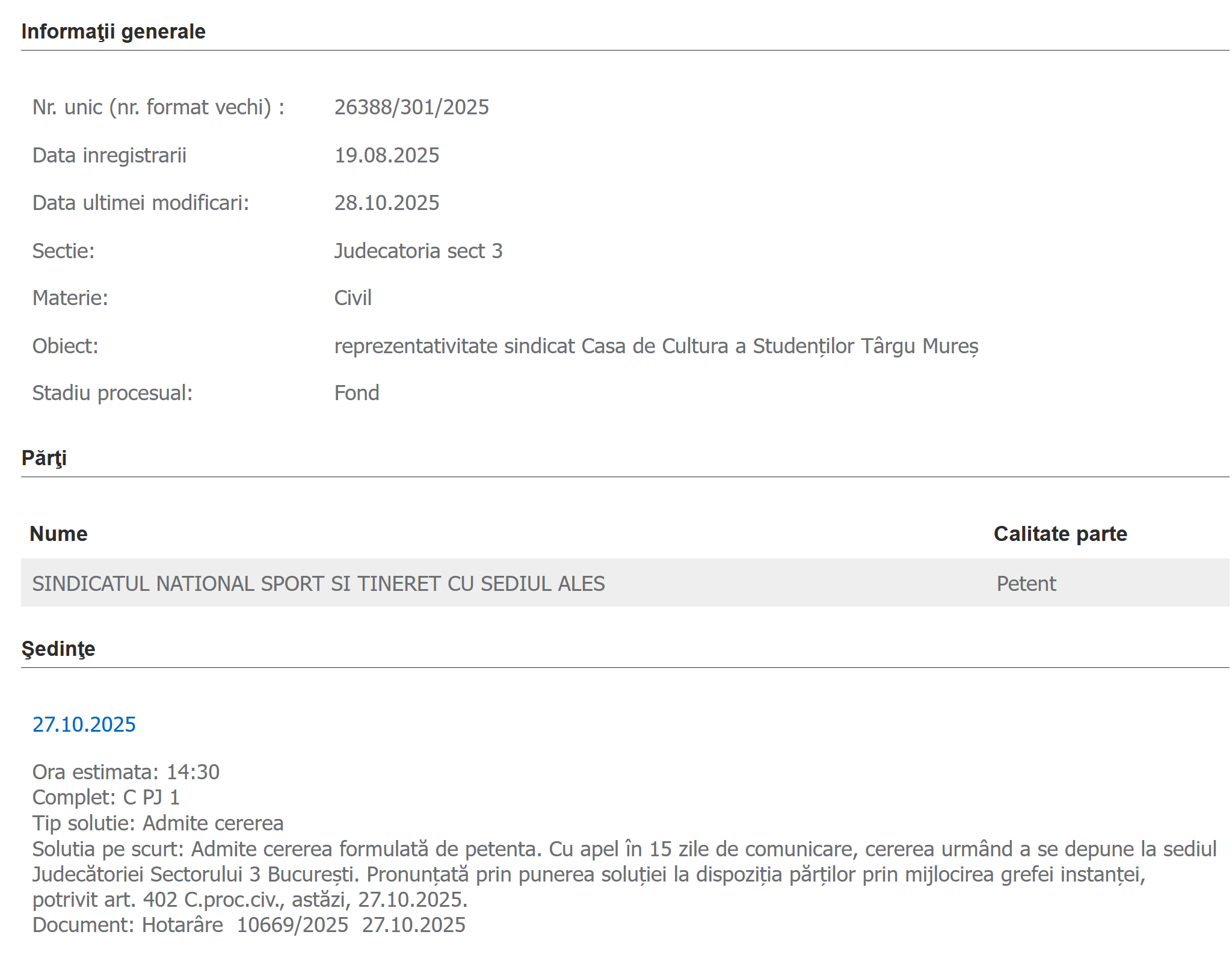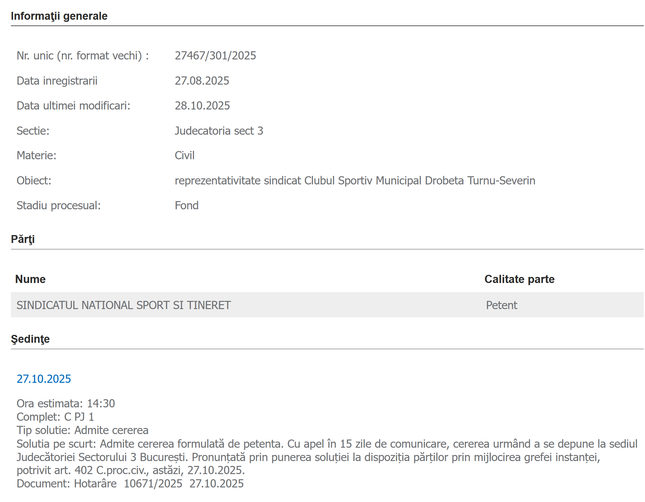 Judecătoria sectorului 3 București a constatat că Sindicatul Național Sport și Tineret – SNST este reprezentativ la nivelul următoarelor unități: Casa de Cultură a Studenţilor Sibiu, Clubul Sportiv Municipal Timişoara, Direcţia Judeţeană pentru Sport şi Tineret Iaşi, Clubul Sportiv Municipal Drobeta Turnu-Severin, Casa de Cultura a Studenţilor Târgu Mureş și Clubul Sportiv “Chimia” Râmnicu Vâlcea: