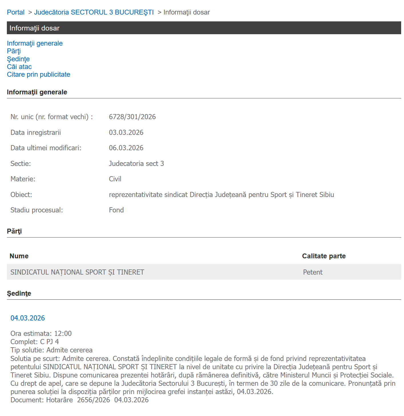 Judecătoria Sector 3 București a constatat că Sindicatul Național Sport și Tineret – SNST este reprezentativ la nivel de unitate – Direcția Județeană pentru Sport și Tineret Sibiu: