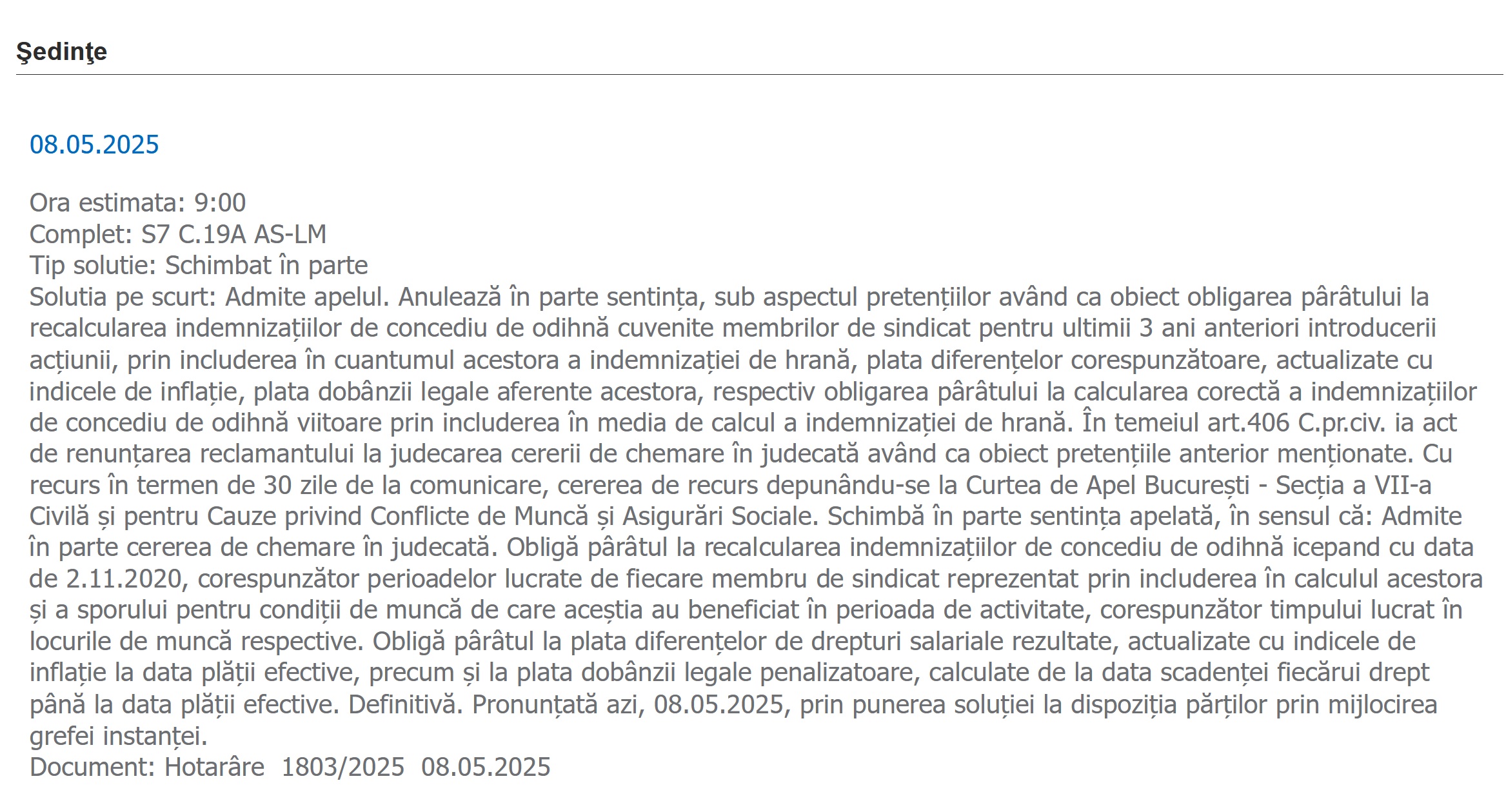 În Dosarul nr. 32756/3/2023 înregistrat de SNST în data de 02.11.2023 la Tribunalul București și apoi, în apel, la Curtea de Apel București, la data de 14.10.2024, în numele membrilor de sindicat de la Clubul Sportiv “Unirea” Focșani, instanța a admis în parte acţiunea formulată de reclamantul Sindicatul Național Sport și Tineret și a dispus astăzi, 8 mai 2025: