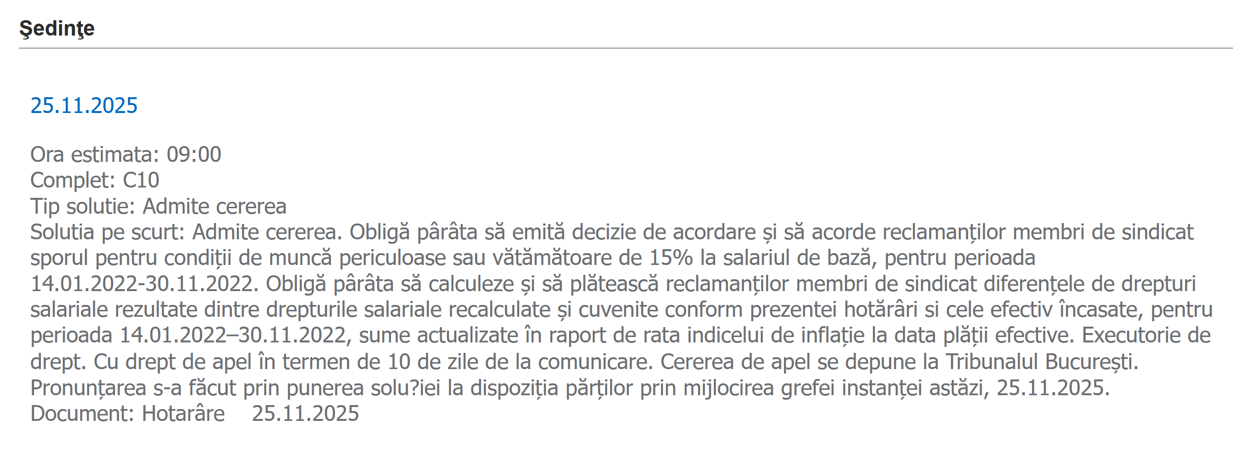 Solutia pe scurt: Admite cererea. Obligă pârâta să emită decizie de acordare şi să acorde reclamanţilor membri de sindicat sporul pentru condiţii de muncă periculoase sau vătămătoare de 15% la salariul de bază, pentru perioada 14.01.2022-30.11.2022. Obligă pârâta să calculeze şi să plătească reclamanţilor membri de sindicat diferenţele de drepturi salariale rezultate dintre drepturile salariale recalculate şi cuvenite conform prezentei hotărâri si cele efectiv încasate, pentru perioada 14.01.2022–30.11.2022, sume actualizate în raport de rata indicelui de inflaţie la data plăţii efective. Executorie de drept. Cu drept de apel în termen de 10 de zile de la comunicare. Cererea de apel se depune la Tribunalul Bucureşti. Pronunţarea s-a făcut prin punerea solu?iei la dispoziţia părţilor prin mijlocirea grefei instanţei astăzi, 25.11.2025.