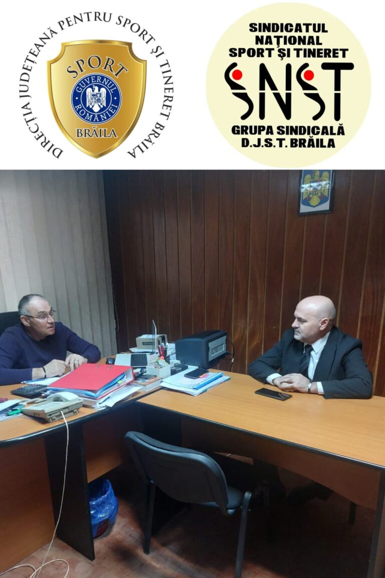 Marți, 31 martie 2026, a avut loc, la Direcția Județeană de Sport Brăila, o întrevedere între sindicat și conducerea instituției. Discuțiile s-au desfășurat în prezența domnului Nicușor Hagiu, director executiv al DJST Brăila, fiind abordate teme relevante pentru activitatea și funcționarea instituției, precum și pentru situația salariaților din domeniu.