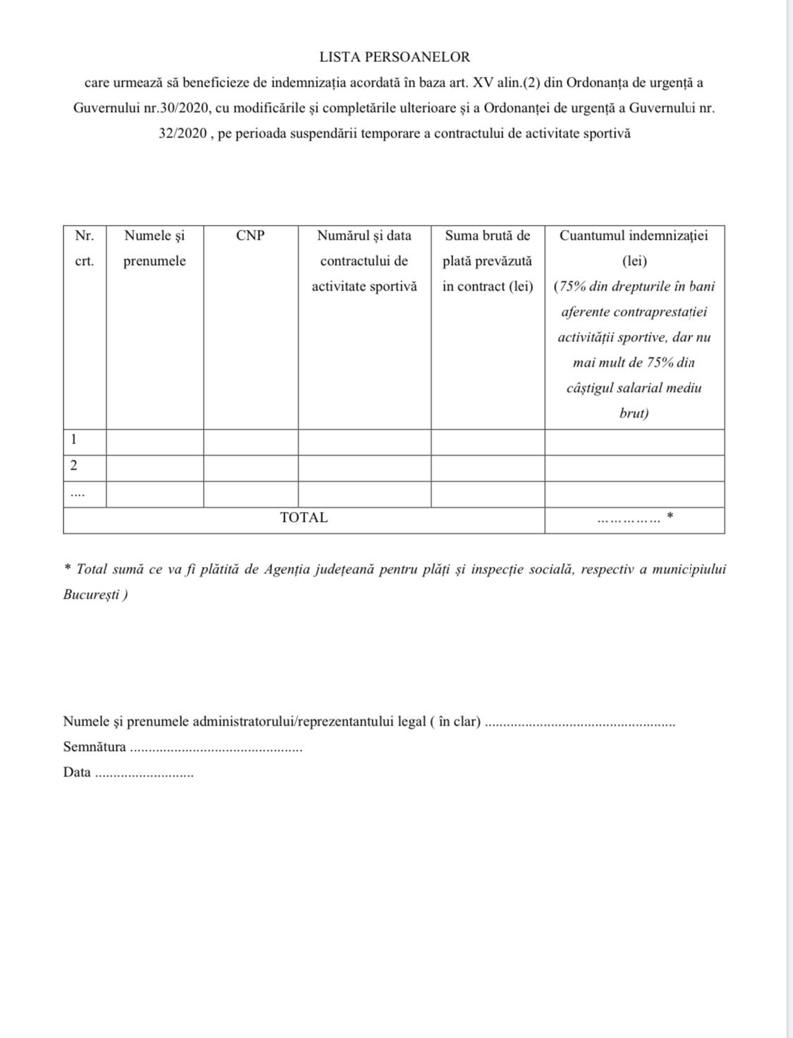 Precizăm că, pentru a beneficia de indemnizațiile prevăzute de lege, este necesar ca activitatea sportivă a structurilor de specialitate sa fie suspendată ca urmare a efectelor produse de coronavirusul SARS-CoV-2.