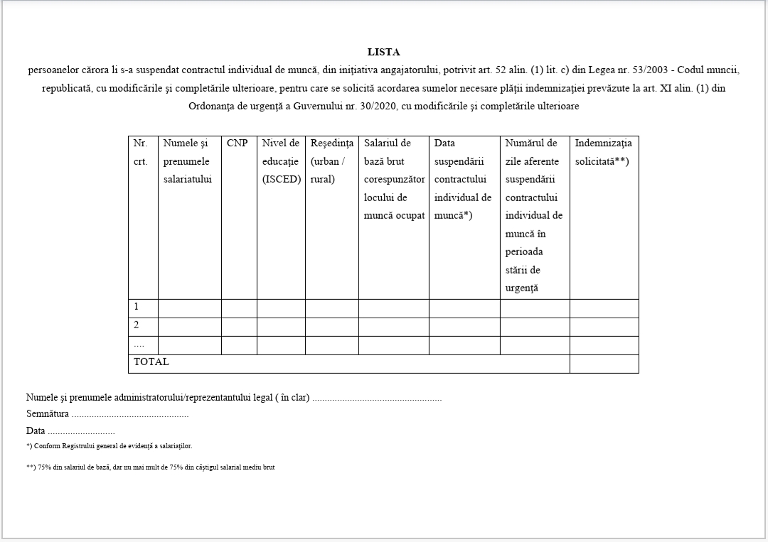 2. În cazul suspendării temporare a contractelor individuale de muncă, din iniţiativa structurii sportive, potrivit art. 52 alin. (1) lit. c) din Legea nr. 53/2003 – Codul muncii, republicată, cu modificările şi completările ulterioare, ca urmare a efectelor produse de coronavirusul SARS-CoV-2, pe perioada stării de urgenţă pe teritoriul României instituite prin Decretul nr. 195/2020, pentru a beneficia de indemnizaţia raportată la 75% din salariul de bază corespunzător locului de muncă ocupat ce se suportă din bugetul asigurărilor pentru şomaj, dar nu mai mult de 75% din câştigul salarial mediu brut prevăzut de Legea bugetului asigurărilor sociale de stat pe anul 2020 nr. 6/2020, structurile sportive afectate depun, începând cu data de 01.04.2020, prin poşta electronică, la agenţiile teritoriale pentru ocuparea forței de muncă, în raza cărora îşi au sediul social, o cerere semnată şi datată de reprezentantul legal, însoţită de o declaraţie pe propria răspundere, la care se ataşează lista cu participanţii la activitatea sportivă cărora le-au fost suspendate contractele individuale de muncă.