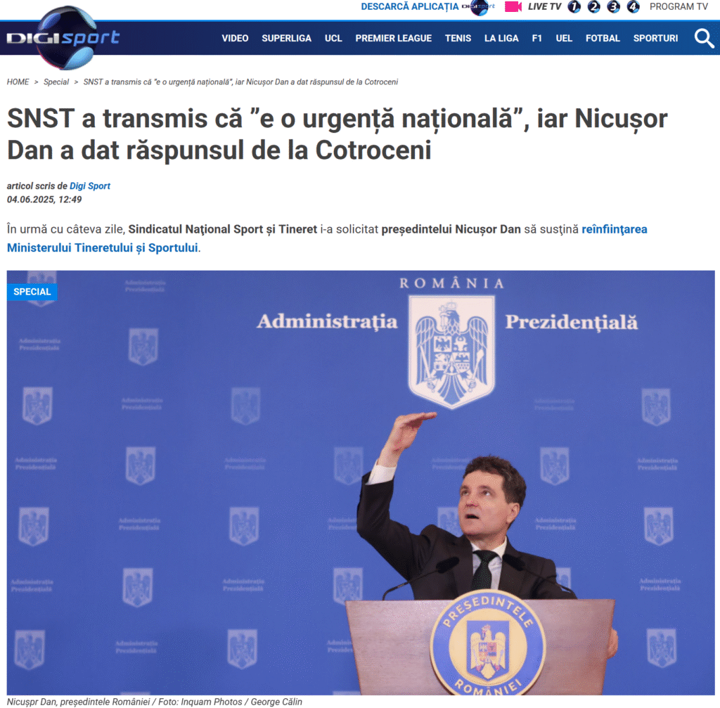 În conferința de presă de la Cotroceni, din 4 iunie 2025, președintele Nicușor Dan a fost întrebat de ziariști despre solicitarea SNST privind reînființarea Ministerului Tineretului și Sportului.Răspunsul său a fost vag: 🗣️ „Este o întrebare tehnică la care nu am răspuns în momentul acesta.” SNST consideră că acest subiect este o urgență națională, nu […]