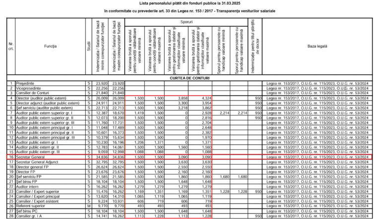 De asemenea, atașăm lista salariilor de la Curtea de Conturi la data de 31.03.2025 și extragem salariul de bază al secretarului general, care era de 34.836 lei, la care se adaugă: